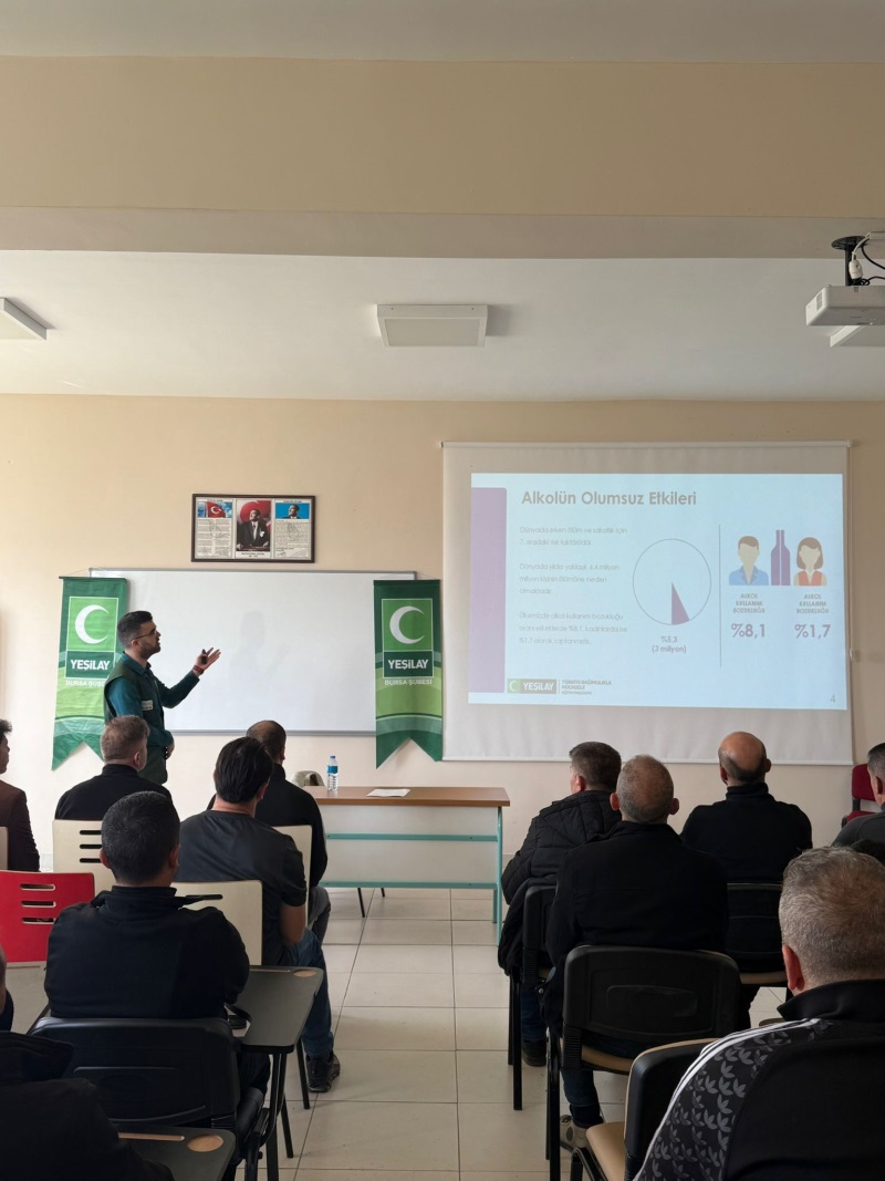 Bursa Yeşilay ile yapılan iş birliği kapsamında kurumumuzda 28.11.2025 tarihinde hükümlü bireylere yönelik “”Alkol ve Kumar Bağımlılığı” konularında bilgilendirme seminerleri gerçekleştirilmiştir.